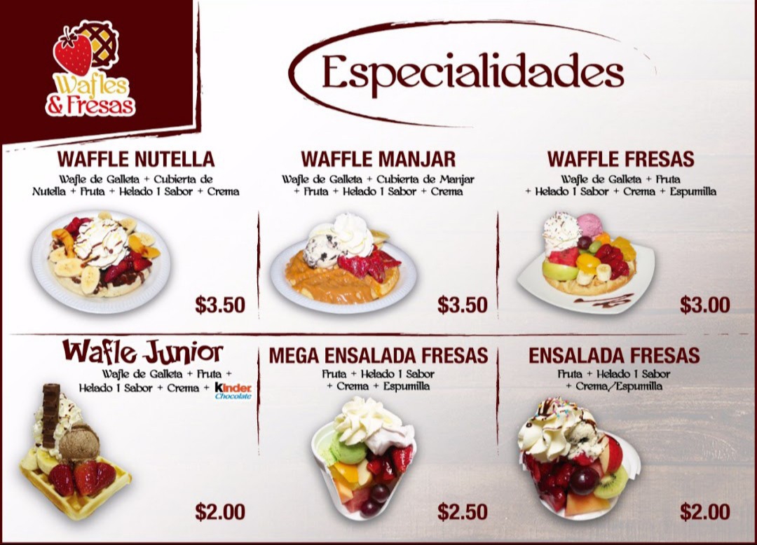 Galleta de wafle caliente bañado con manjar mas fresa, guineo y durazno. un delicioso sabor de helado. acompañado de crema chantilli