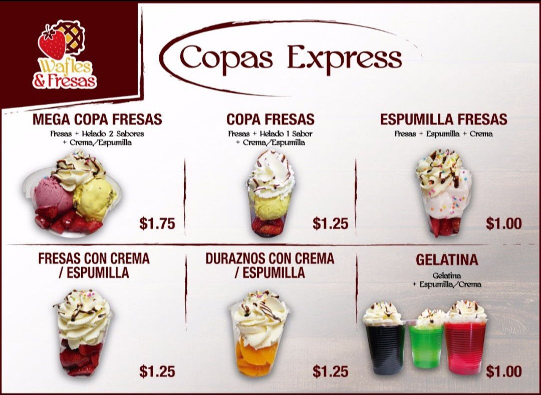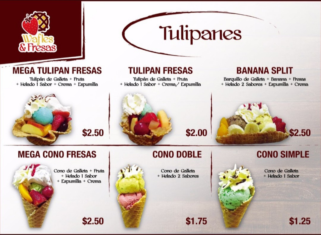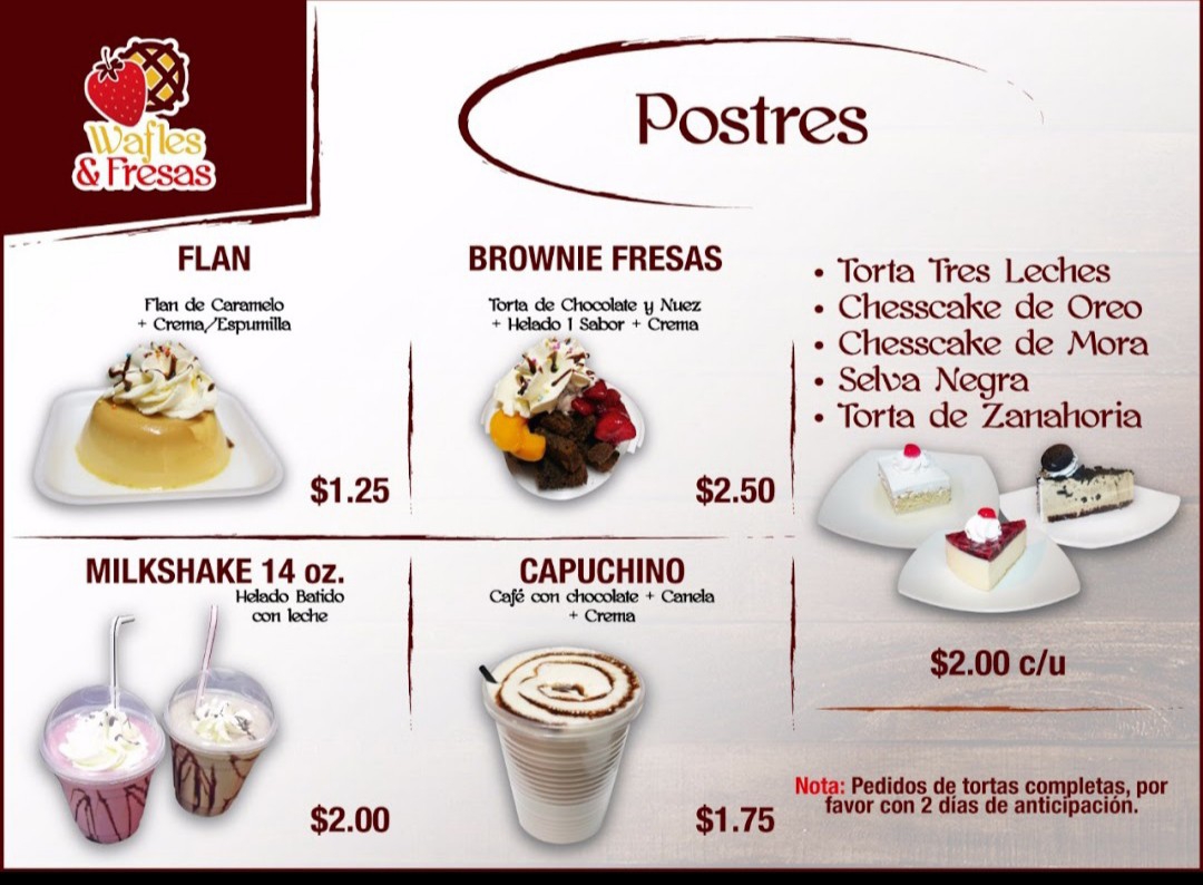 The menu at Wafles & Fresas offers a delightful array of desserts, snacks, and drinks that cater to various tastes. For dessert lovers, there are options like Red Velvet Cake, Oreo Cookie Cheesecake, and Carrot Cake with Walnuts. The creamy Red Berry Cheesecake and Caramel Flan with Cream are also great choices. For those with a fruity preference, the Mega Peach Cup with Cheese and Fruit Salads, such as Mega Strawberry Salad and Strawberries with Cream, provide a refreshing twist. Their waffle selection is impressive, with offerings like Manjar Waffle, Strawberry Waffle, and Nutella Waffle, catering to both traditional and sweet cravings. Additionally, Junior Waffle is a smaller, kid-friendly option. If you're looking for indulgence, the Brownie with Strawberries is an excellent pick. For a drink, enjoy a hot Chocolate Caliente or a cold Iced Coffee, Milkshake, or Juice. The Double Cone with Cheese or Banana Split with Cheese are unique and delicious ice cream options. The menu also features savory items like the Mixed Toast and Cheese Toast. Don’t forget the Tulipanes Artesanales, including the Banana Split and Strawberry Cream Tulipan. Whether you're in the mood for a dessert, a light snack, or a refreshing drink, Wafles & Fresas offers a wide variety of options that promise to satisfy all tastes.