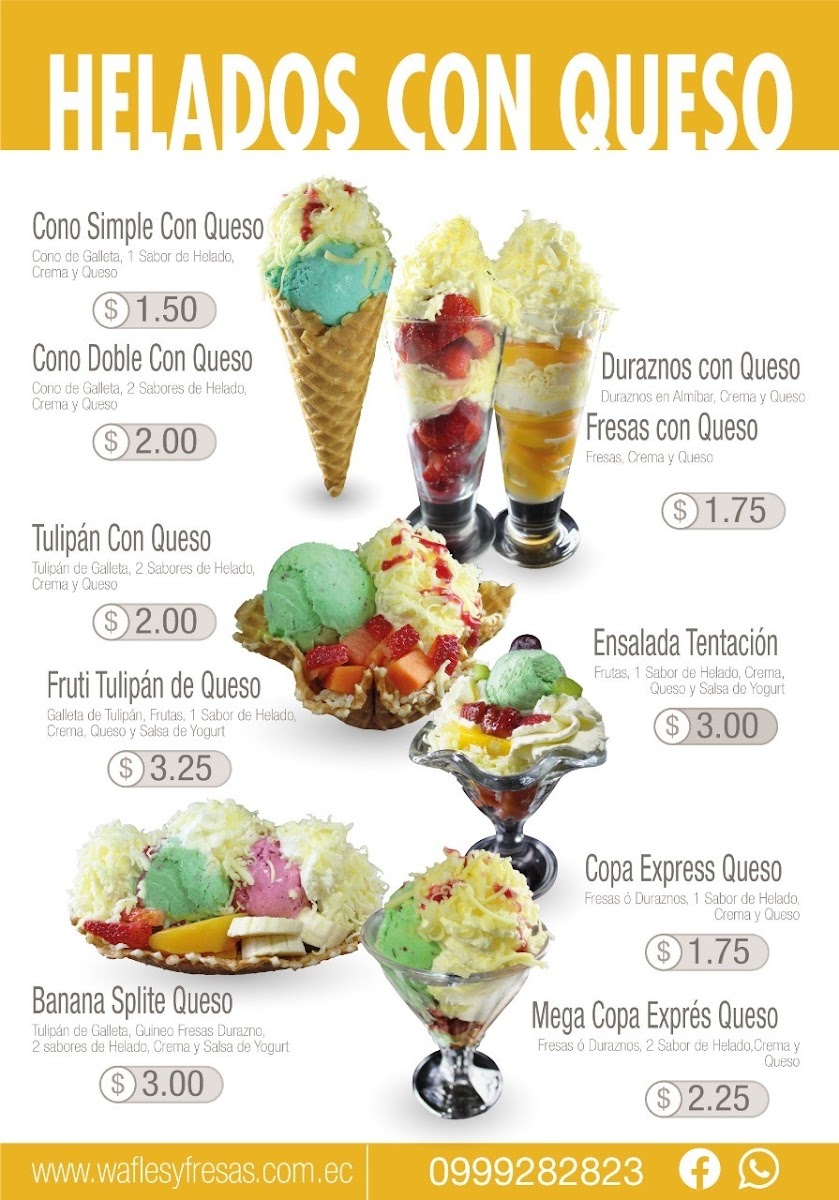 Wafle caliente con 9 variedades de fruta un delicioso sabor de helado acompañado de crema y espumilla de la casa.